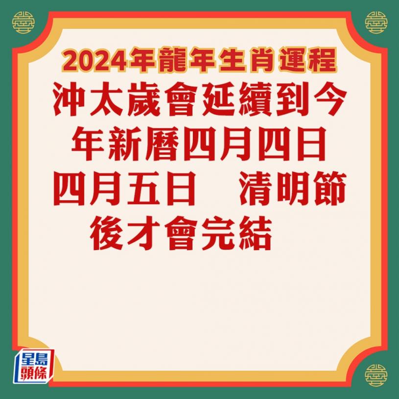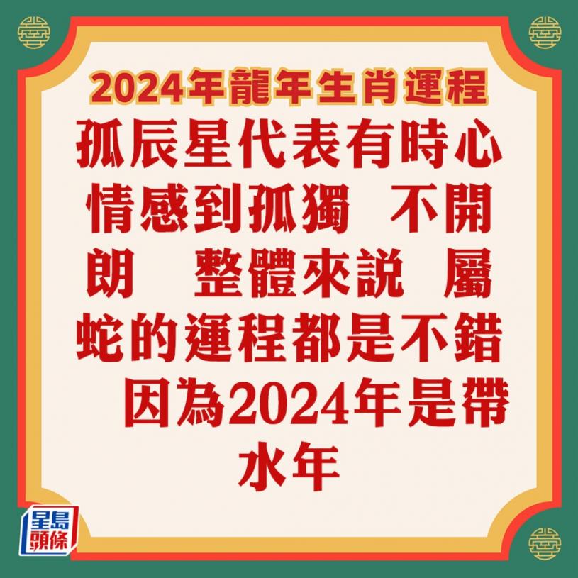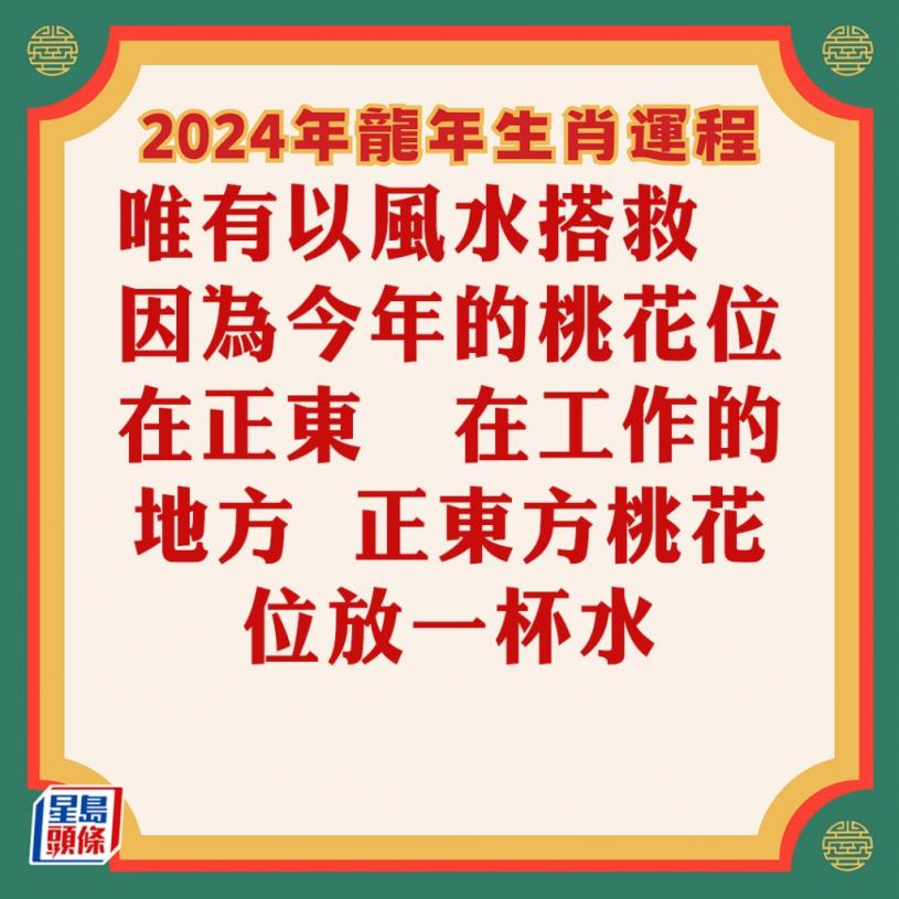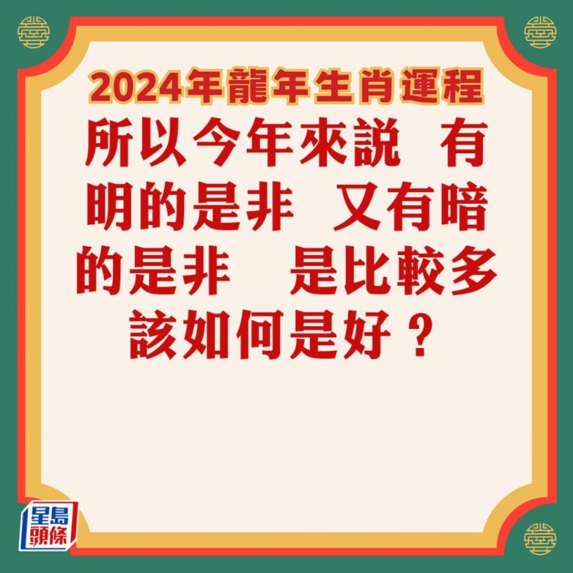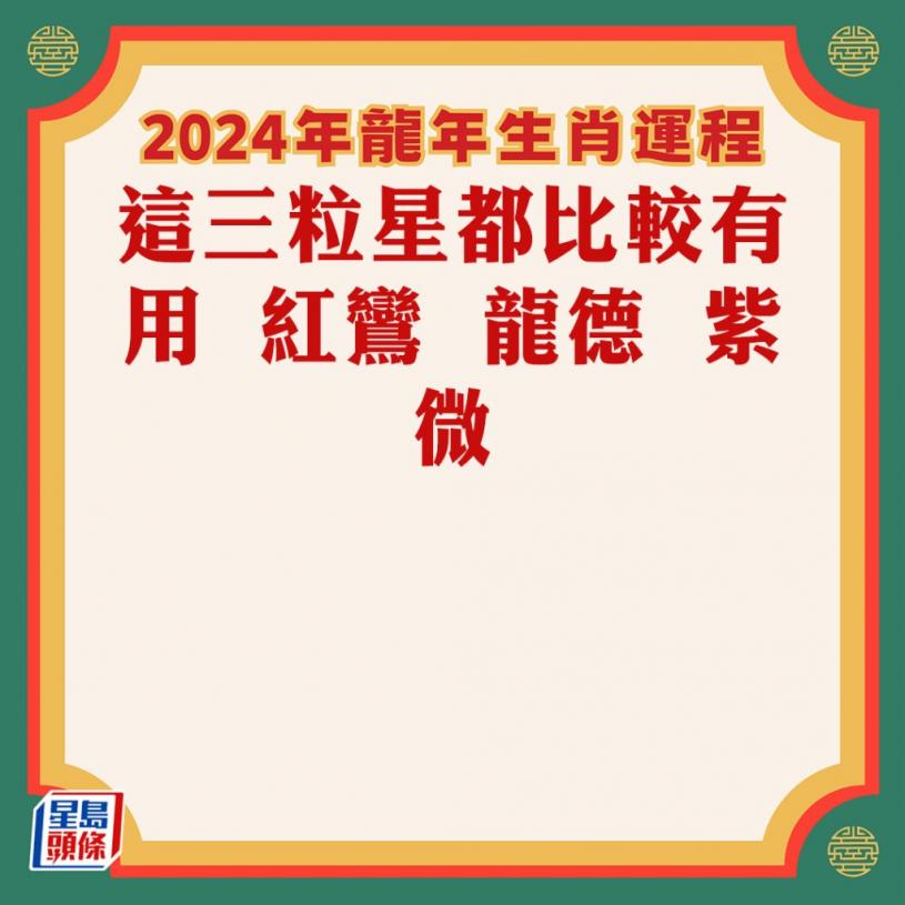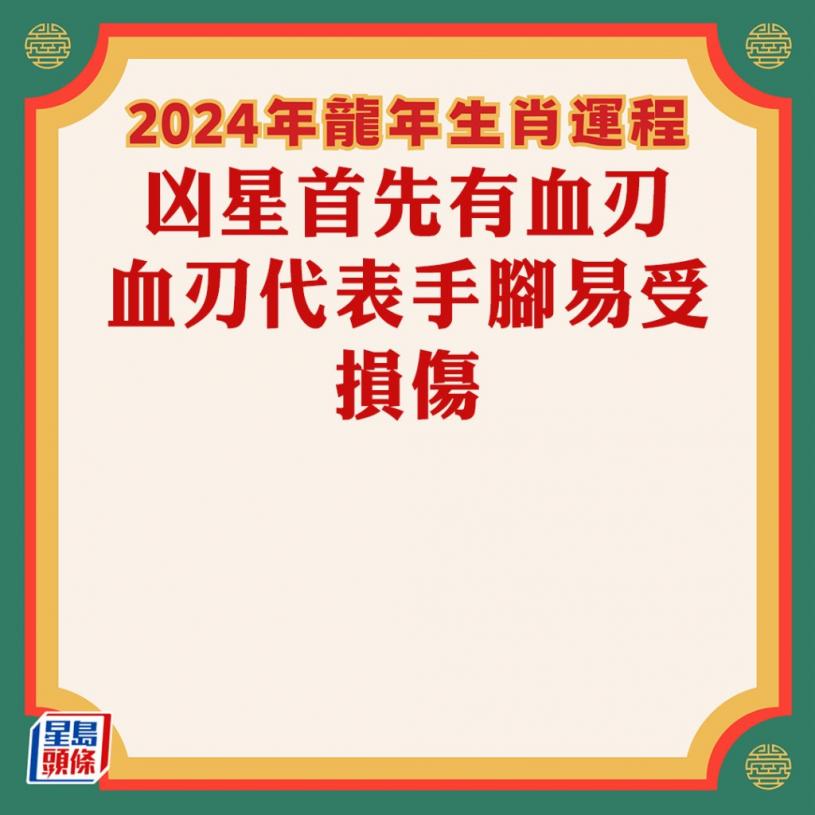 凶星有亡神代表失物,容易遗失银包、锁匙、手提电话及私人物件。特别要留意的是天官符,是普通的是非星,不过,今年又有贵人又有红鸾,是非星发挥不到大的作用。不论春夏秋冬出生的人都可以看高一线,只不过2024年是大水年,对春夏天出生的人稍为有利。