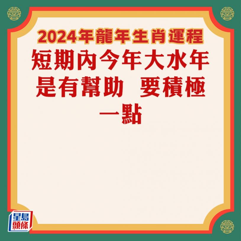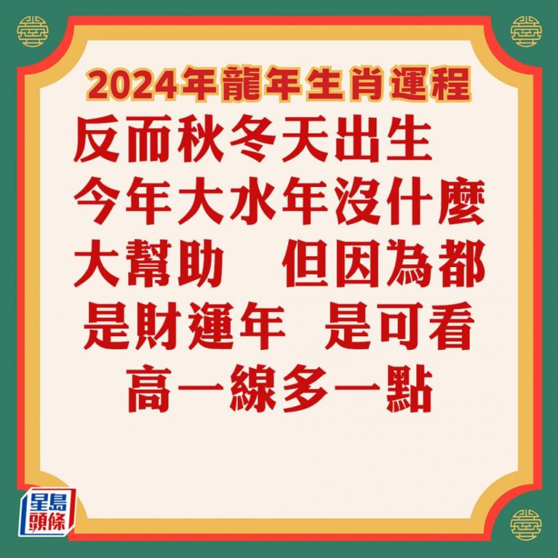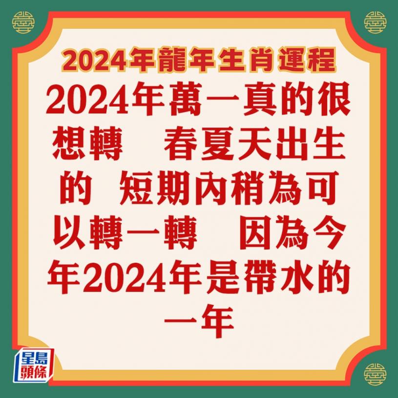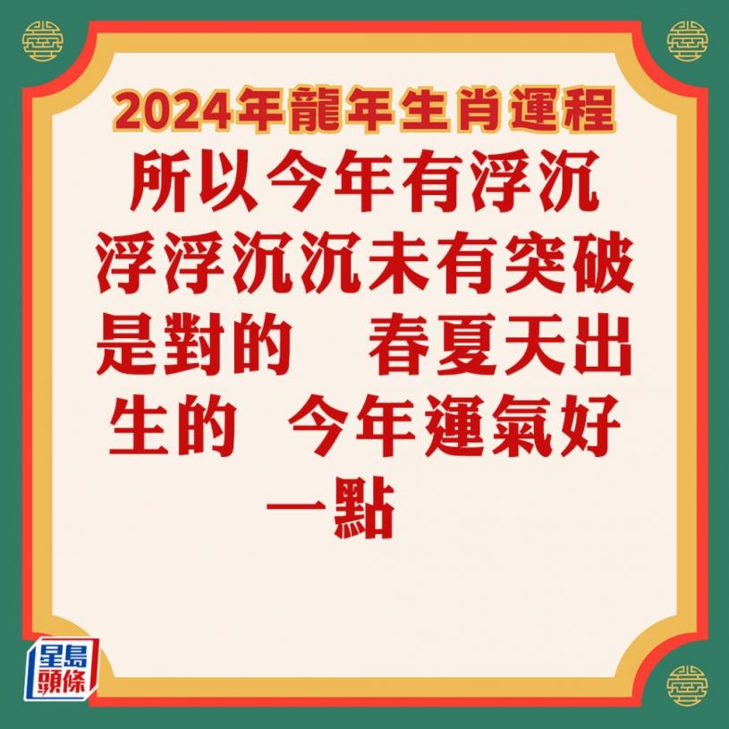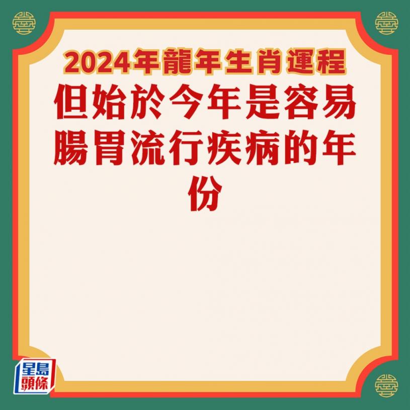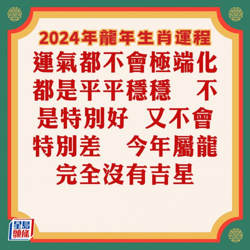 属龙今年来说肠胃比较差,农历三、六、九、十二月都要留意,所以今年在饮食上要小心,生冷及煎炸食物少吃为妙。运气方面没有直接关系,虽然属龙的运气只是排名第十二,但主因是受到犯太岁影响,其实今年的运气都比较平稳,今年来说是带水年,对春夏天出世的人有利,但秋冬天出世是没有用。如果是春夏天出世,这两年工作不如意,希望转工的话,2024年是短期内唯一一年可以转工。相反,在秋冬天出世如不太着急的话,可待2025年、2026年才大举进攻都不迟,所以今年不论是春夏秋冬出生的人,运气都不会极端化都是平稳,不会特别好又不会特别差。