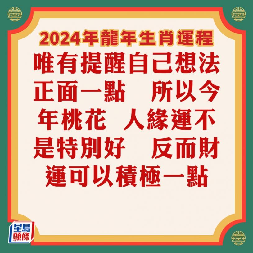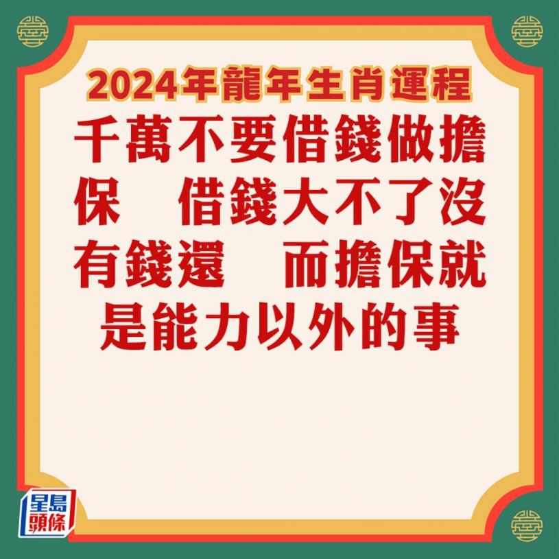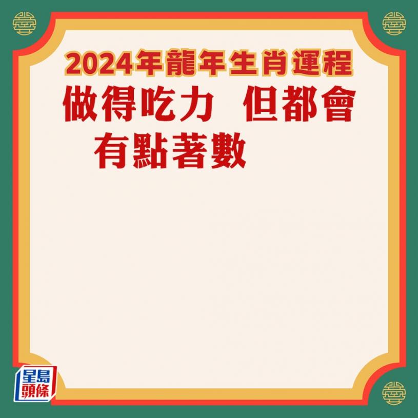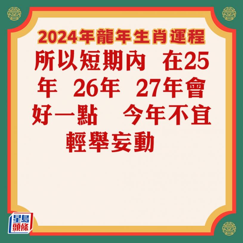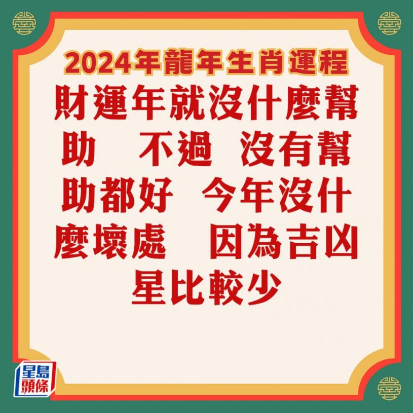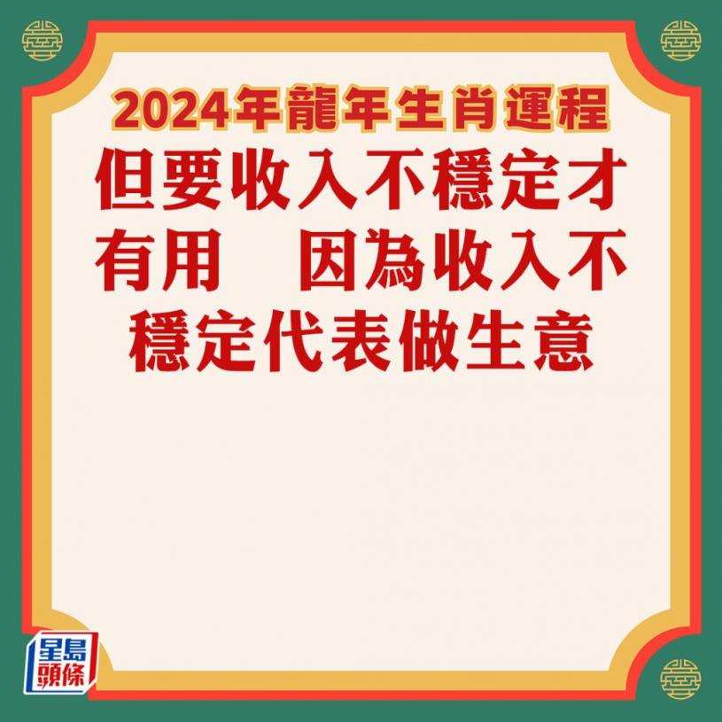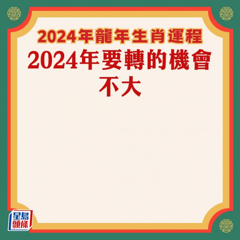 属龙今年来说肠胃比较差,农历三、六、九、十二月都要留意,所以今年在饮食上要小心,生冷及煎炸食物少吃为妙。运气方面没有直接关系,虽然属龙的运气只是排名第十二,但主因是受到犯太岁影响,其实今年的运气都比较平稳,今年来说是带水年,对春夏天出世的人有利,但秋冬天出世是没有用。如果是春夏天出世,这两年工作不如意,希望转工的话,2024年是短期内唯一一年可以转工。相反,在秋冬天出世如不太着急的话,可待2025年、2026年才大举进攻都不迟,所以今年不论是春夏秋冬出生的人,运气都不会极端化都是平稳,不会特别好又不会特别差。