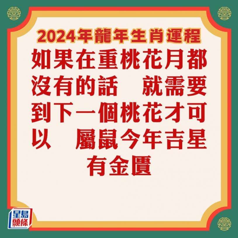 因为2024年正式到四月四日、四月五日清明节才开始,农历二月还有一个重桃花月,如果在重桃花月都没有的话,就需要到下一个桃花才可以。属鼠今年吉星有金匮,代表财帛有利,是储积财富的夹万,所以今年赚到钱容易聚财。将星代表权力提升,但权力提升不等于地位提升,可能要管理的事情增多,要做的事情增多,但职位未必有变。
