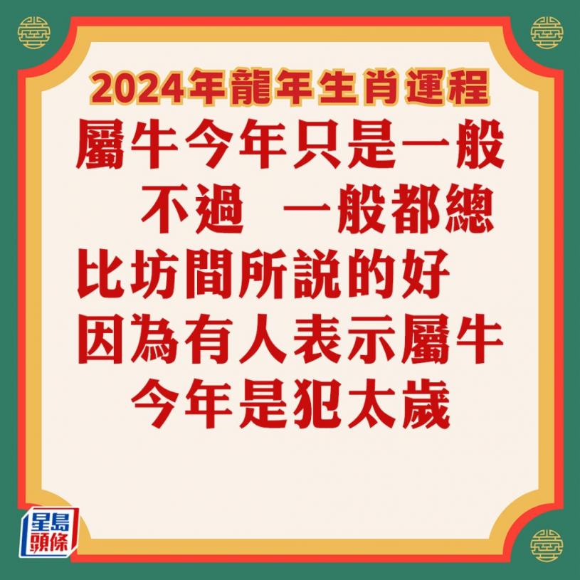 属牛今年只是一般,不过,一般都总比坊间所说的好,因为有人表示属牛今年是犯太岁,因为隔三年就是犯太岁,其实是不对的。龙及羊隔三年;羊及狗隔三年;