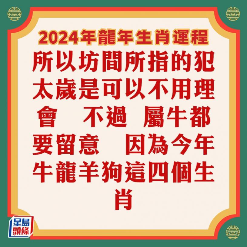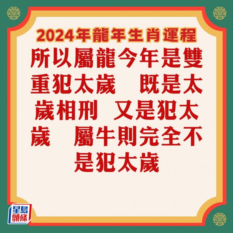 狗跟牛又隔三年。其实三刑,蛇、猴、虎是三刑;羊、狗、牛是三刑。而龙就是跟龙犯太岁,所以属龙今年是双重犯太岁,既是太岁相刑又是犯太岁,属牛则完全不是犯太岁,所以坊间所指的犯太岁是可以不用理会。