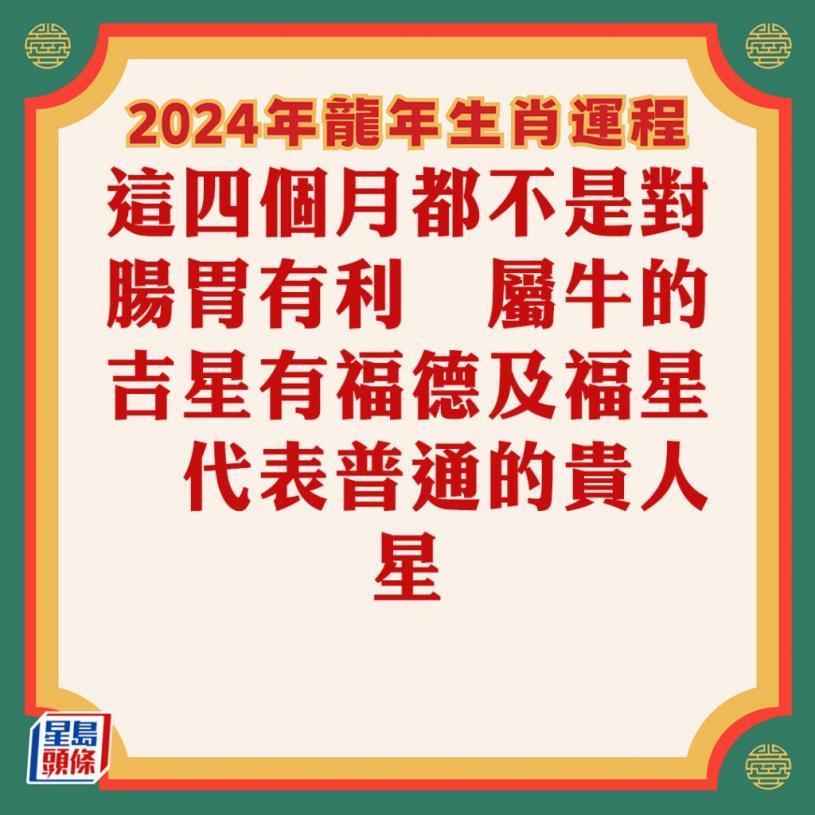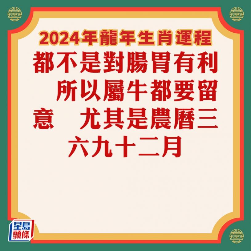 不过,属牛都要留意,因为今年牛、龙、羊狗这四个生肖都不是对肠胃有利,所以属牛都要留意,尤其是农历三、六、九、十二月,这四个月都不是对肠胃有利。