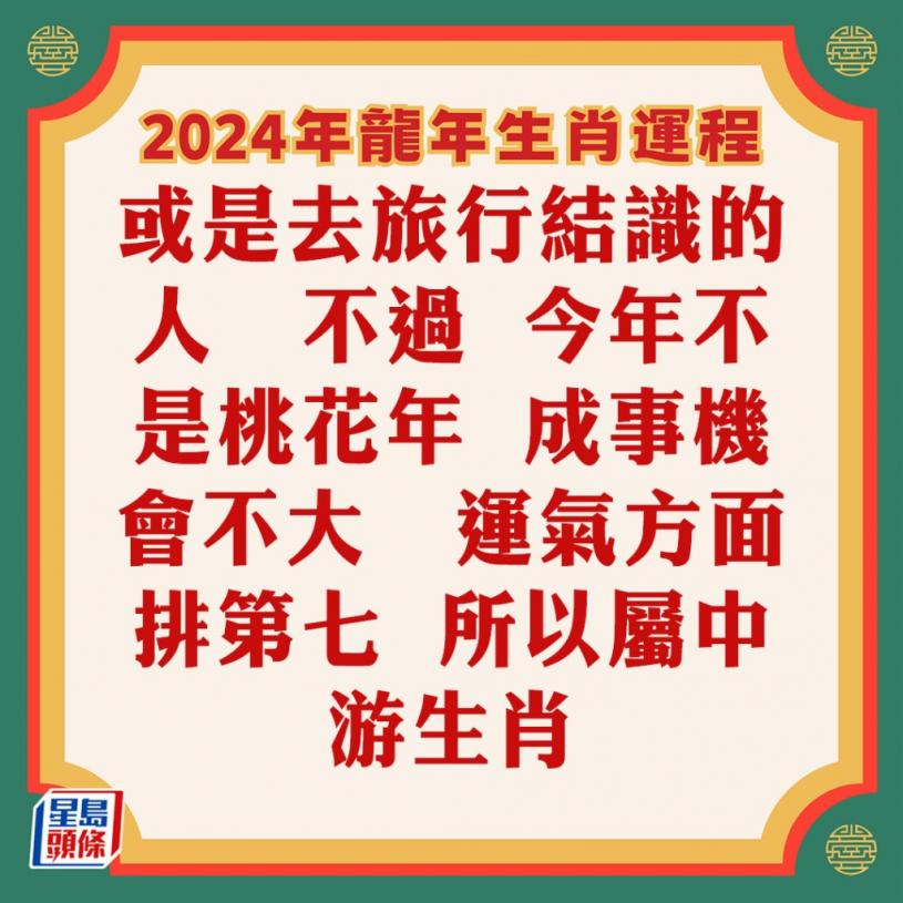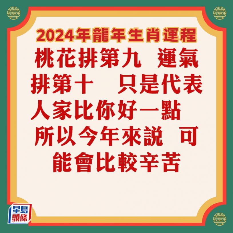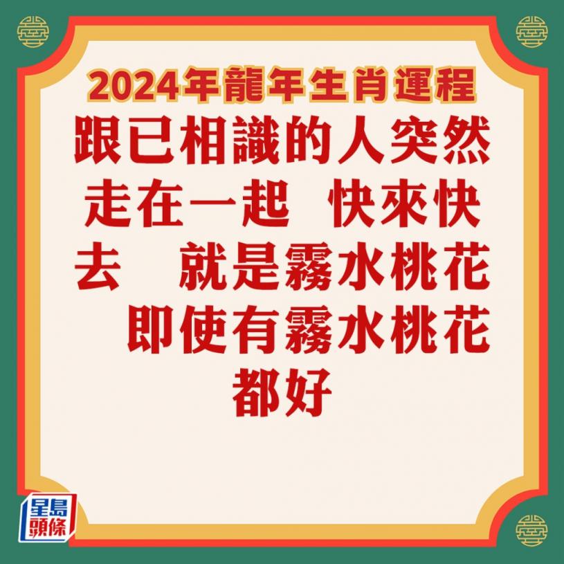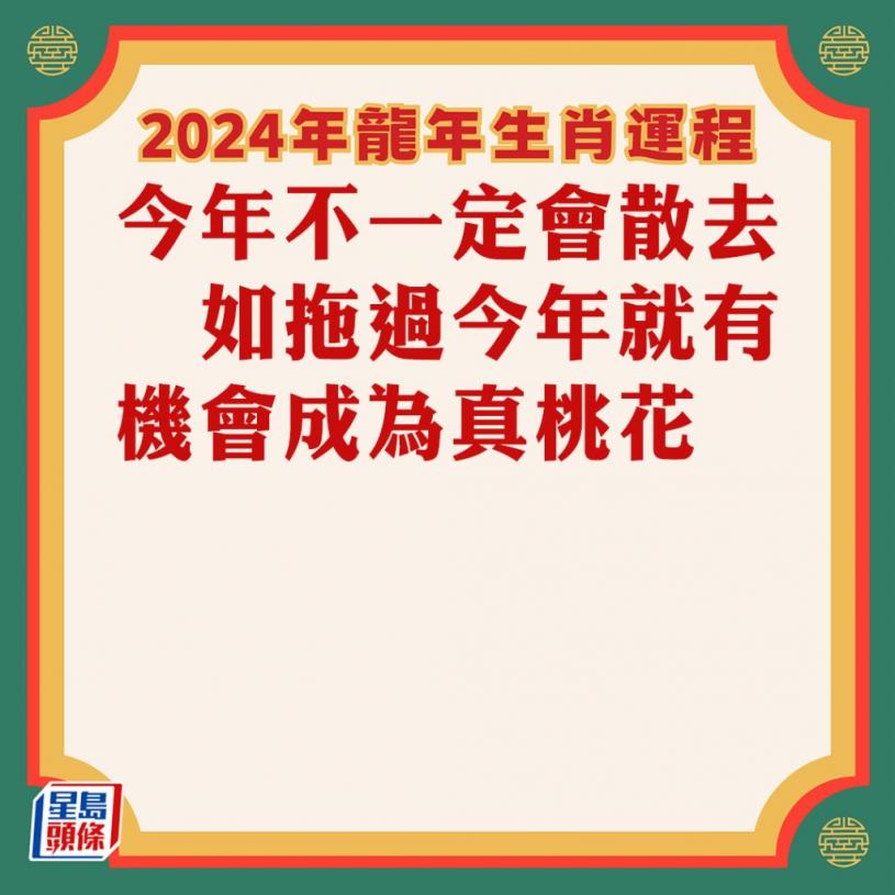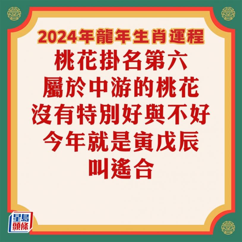 因为吉凶星比较少,桃花排名第六,属于中游的桃花,没有特别好与不好。今年就是寅戊辰叫遥合,遥合最多就是容易出现暗恋对象,今年有桃花机会不是很大,下一个桃花年就要到羊年,即是2027年,暂时桃花还未到来。