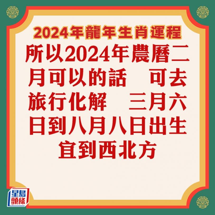 首先是肖龙,大家都知道是犯太岁,犯太岁易有悲观负面情绪,容易胡思乱想,想来想去都没好结果,尤其是农历三月是犯太岁月,宜外游散心,如在春夏天出世,到西北方会有利;在秋冬天出世则到东南方有利。