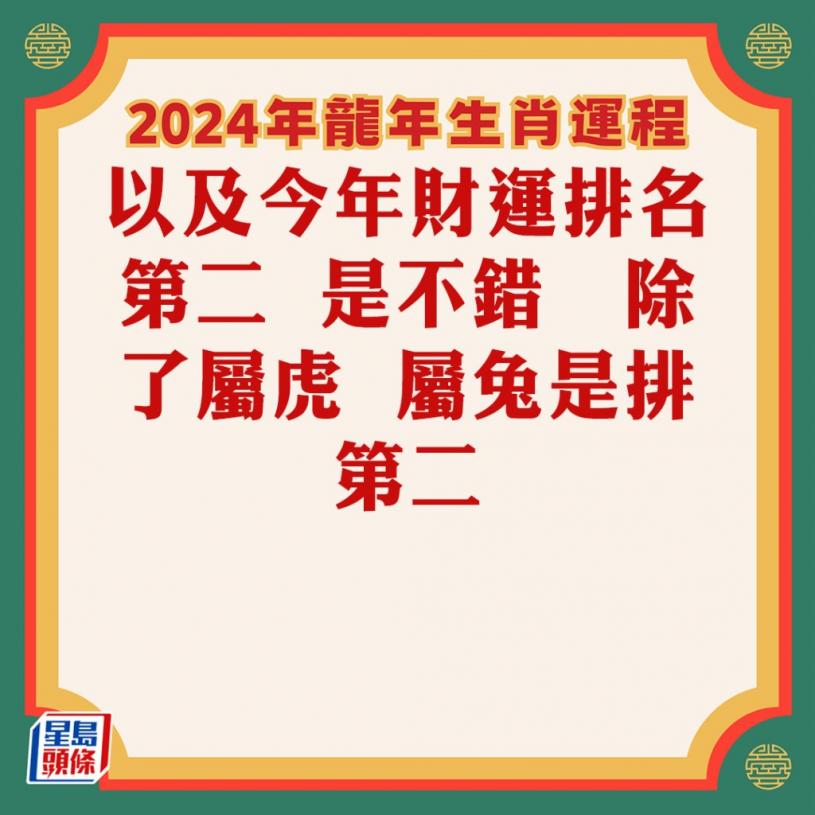 今年财运排名第二是不错,除了属虎,属兔是排第二,因为太岁相穿、太岁相害,因此会比属虎低一位。收入不稳定的今年可以积极进取,尤其是春夏天出生的人,因为2022年及2023年应该是一般,但来到2024年短期内会比较好,加上今年财运年是不错,可以积极争取。即使是秋冬天出生,今年运气一般,但由于是财运年所以都可以看高一线,事业方面都有点进展。
