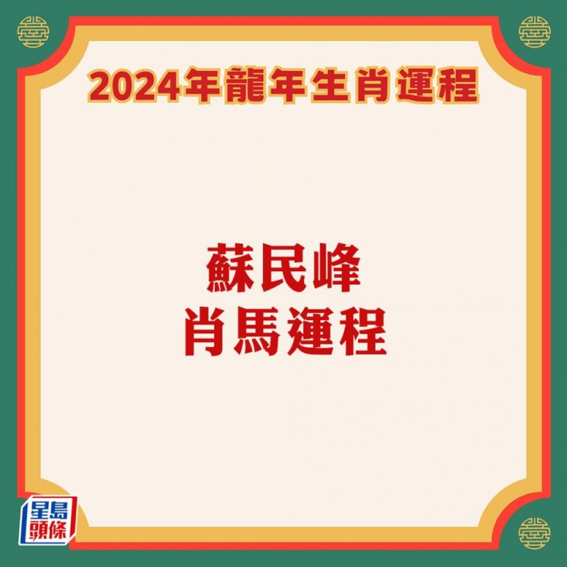 2024年龙年运程,苏民峰分享12生肖开运贴士!苏师傅除了为大家解说各生肖于龙年的运势之外,亦会就桃花及运气订立排名!当然不少得犯太岁须知,以及今年的吉星及凶星的应对方法。