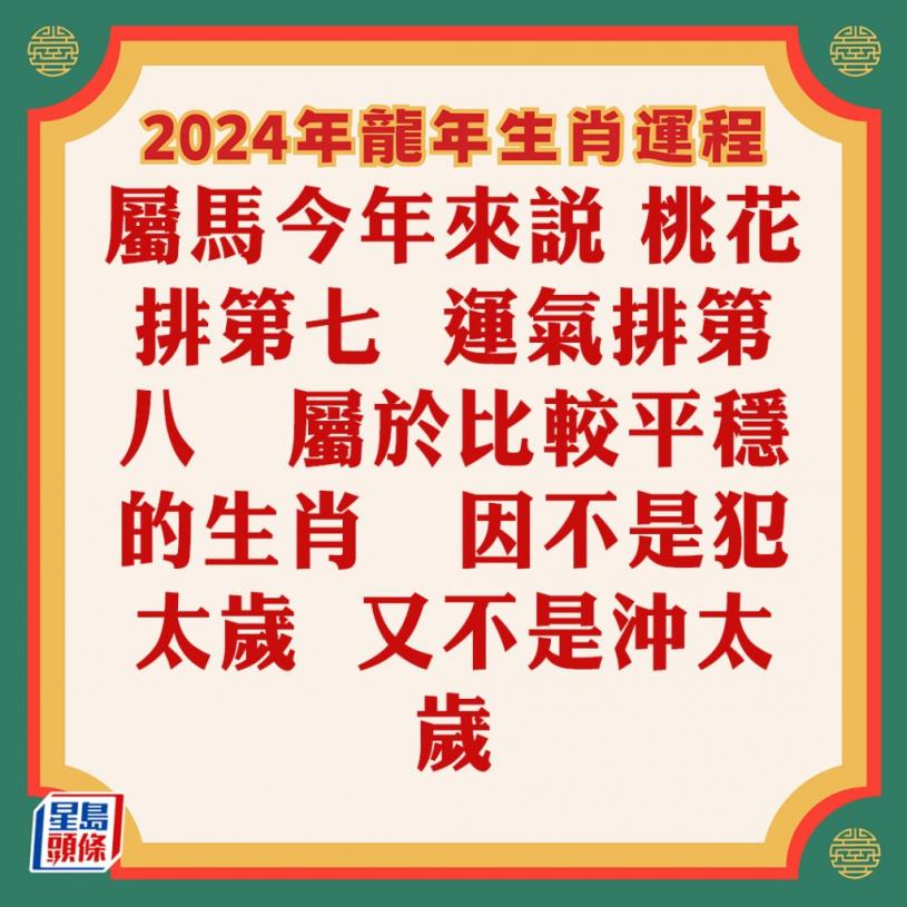 属马今年来说,桃花排名第七,运气排第八,属于比较平稳的生肖。因不是犯太岁又不是冲太岁,亦没有双合,都不是桃花年,所以比较平稳。