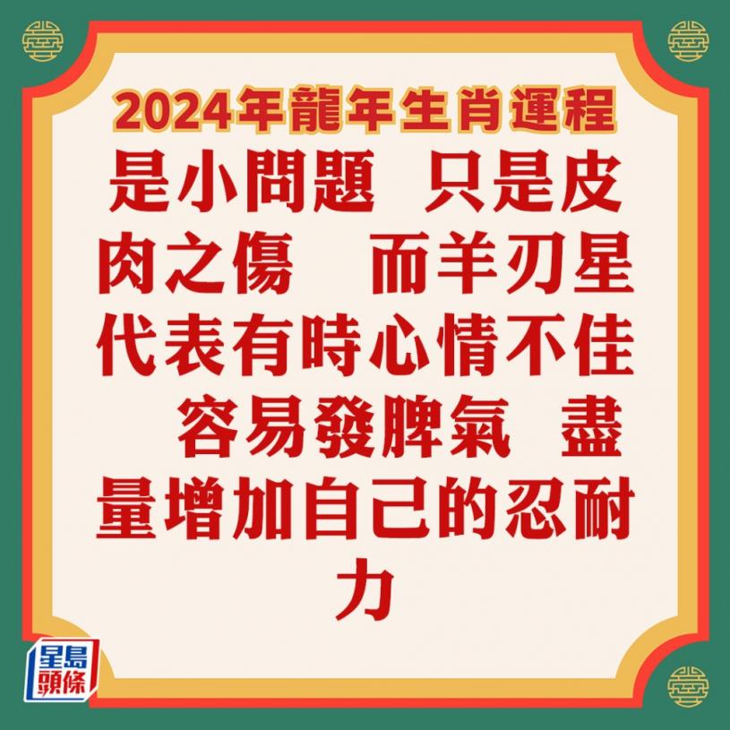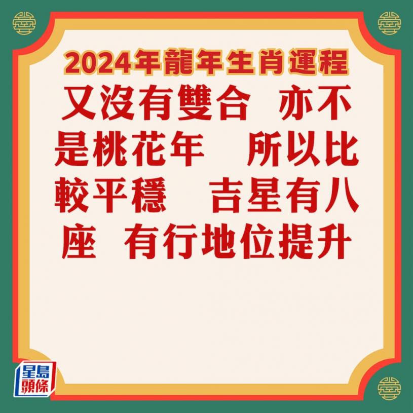 吉星有八座有利地位提升。天解星解神,可逢凶化吉能化凶星之力。而凶星亦不算是很多,首先有血刃,代表手脚易受损伤,但属马来到龙年不是冲太岁,不是犯太岁的话,不会有什么特别严重意外,损伤可能只是撞伤脚或切伤手指,都是小问题,只是皮肉之伤而已。另外是羊刃星,代表有时心情不佳,会容易发脾气,宜尽量增加自己的忍耐力。浮沉星代表浮浮沉沉,暂时没什么突破,因为属马是中游生肖,不论人缘或事业都属中游,所以今年有浮沉未有突破。