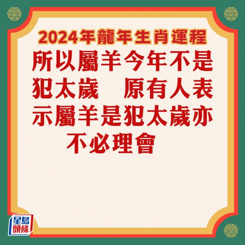有些人指属羊是犯太岁,因为是三刑六冲就是犯太岁,凡事隔三年都说是犯太岁。其实真的懂算命的都知道,三刑六冲不是每次隔三年都犯太岁,所以属羊今年不是犯太岁,如有人表示属羊是犯太岁亦不必理会。