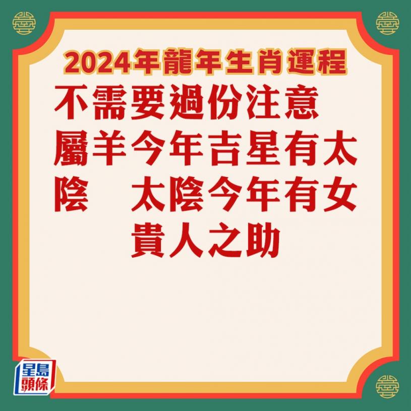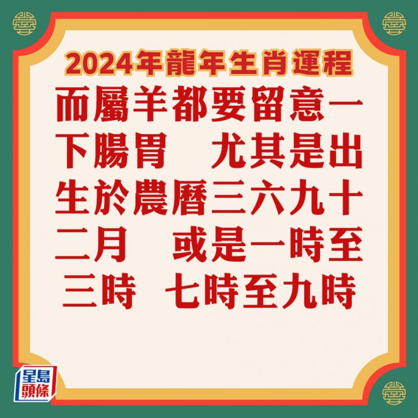 不过,始于今年是容易肠胃病及流行疾病的年份,属羊都要留意一下肠胃问题,尤其是于农历三、六、九、十二月,或是不论在上午或下午,一时至三时、七时至九时出生的人,三项全中的话,特别容易肠胃有问题。如只是属羊则只需略为小心就可以,不必要过份注意。