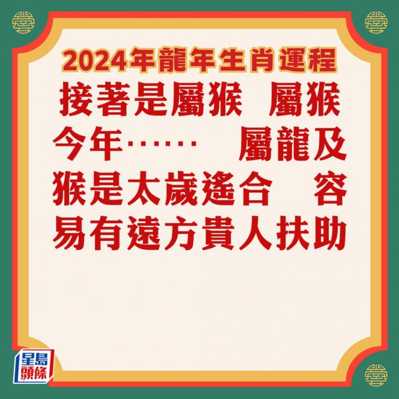 属猴跟属龙是太岁遥合,容易有远方贵人扶助,以及桃花方面可能会有远方的暗恋对象。什么是远方暗恋对象?可能在外地遇到比较心仪的对象,或是去旅行结识的人。不过,今年不是桃花年,所以成事机会不大,运气方面排第七,属中游生肖,但始终太岁暗合人缘好,间接对事业都有帮助。