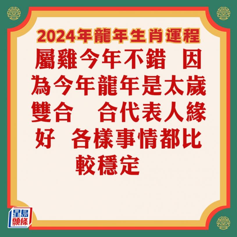 属鸡今年不错,因为今年龙年是太岁双合,“合”代表人缘好,各样事情都比较稳定。2023年冲太岁,不过冲太岁不是立刻完结,会延续到今年新历四月四日至四月五日清明节后才会完结,所以暂时有不稳定因素,在春天都不是太稳定,直到2024年各样事情都开始稳定,所以如2023年能稳固下来,2024年就是比较平稳的一年。
