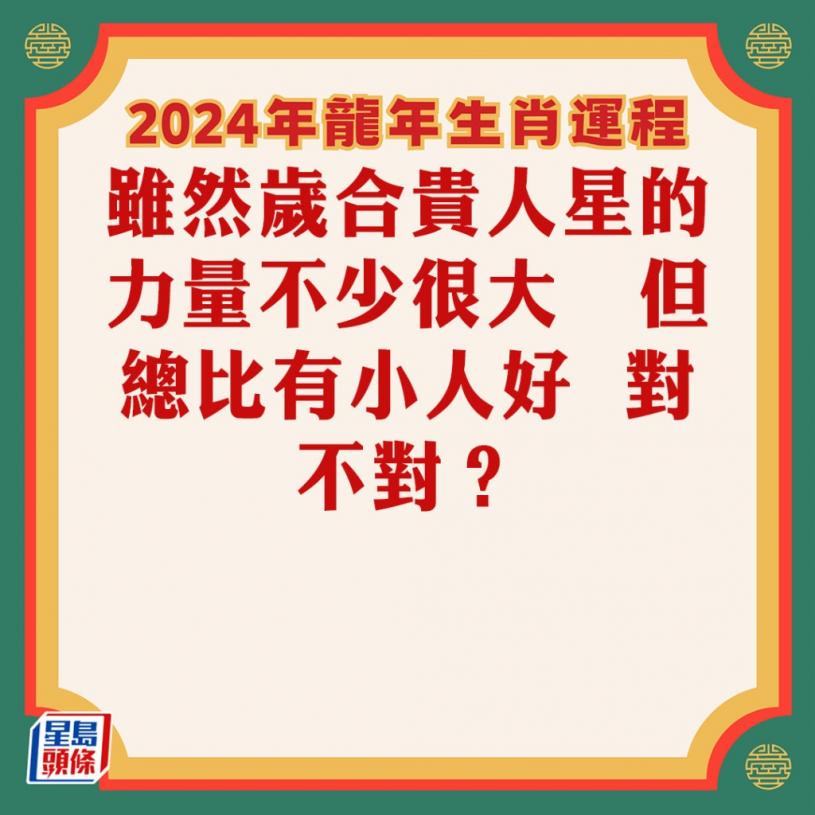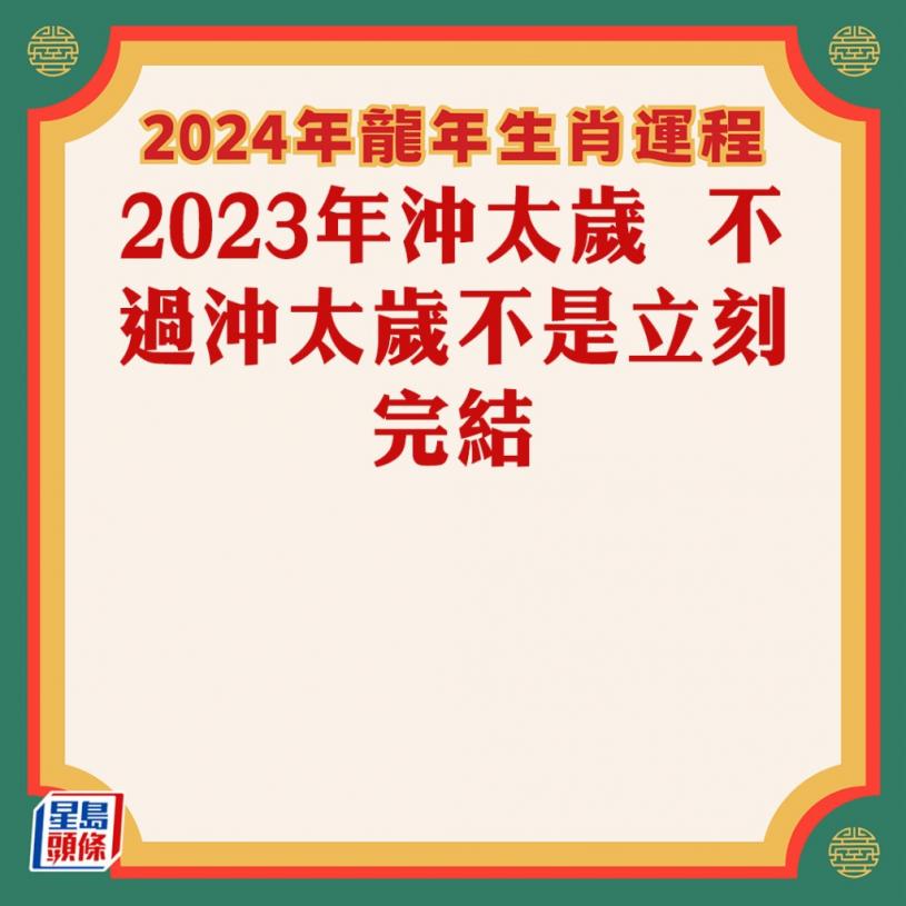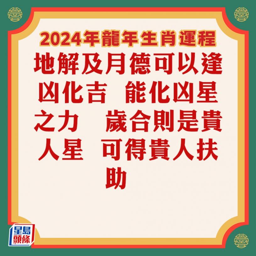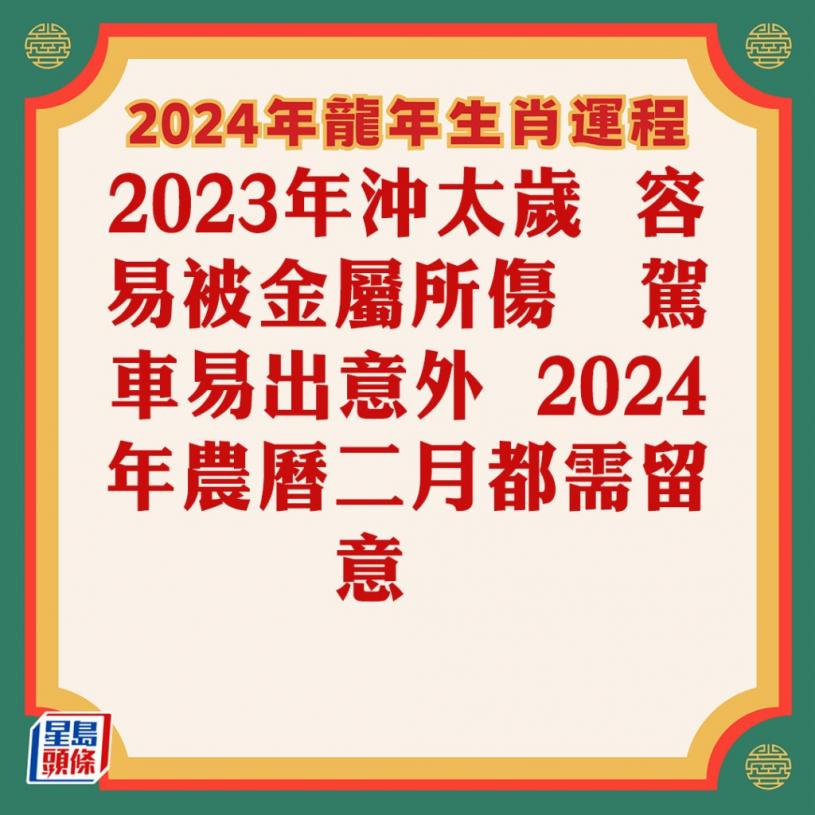 2023年冲太岁容易被金属所伤,驾车易出意外,到2024年农历二月都需留意,当正式踏入新历四月五日之后,就能完全脱离2023年冲太岁的影响。2024年太岁双合,人缘比较好,吉星有地解、岁合及月德。地解及月德可以逢凶化吉,能化凶星之力。岁合则是贵人星,可得贵人扶助,虽然岁合贵人星的力量不少很大,但总比有小人好。