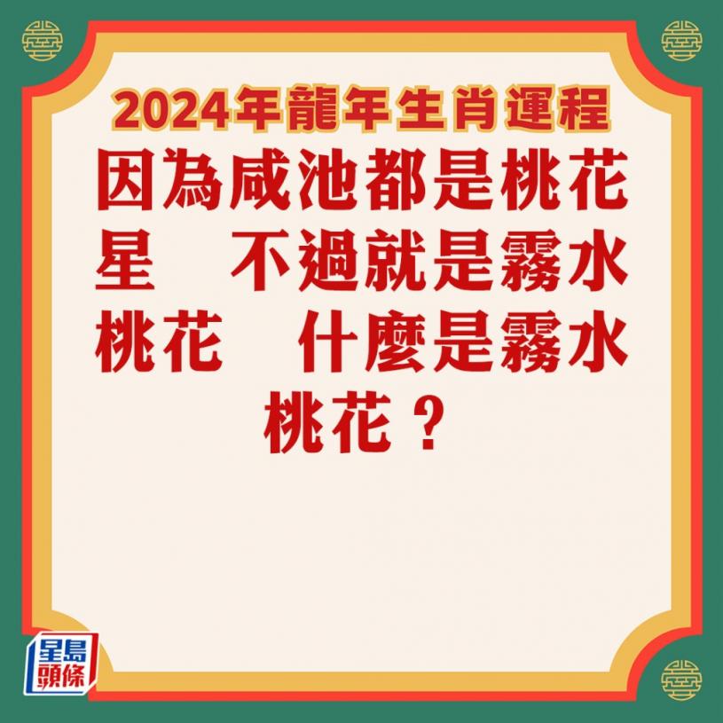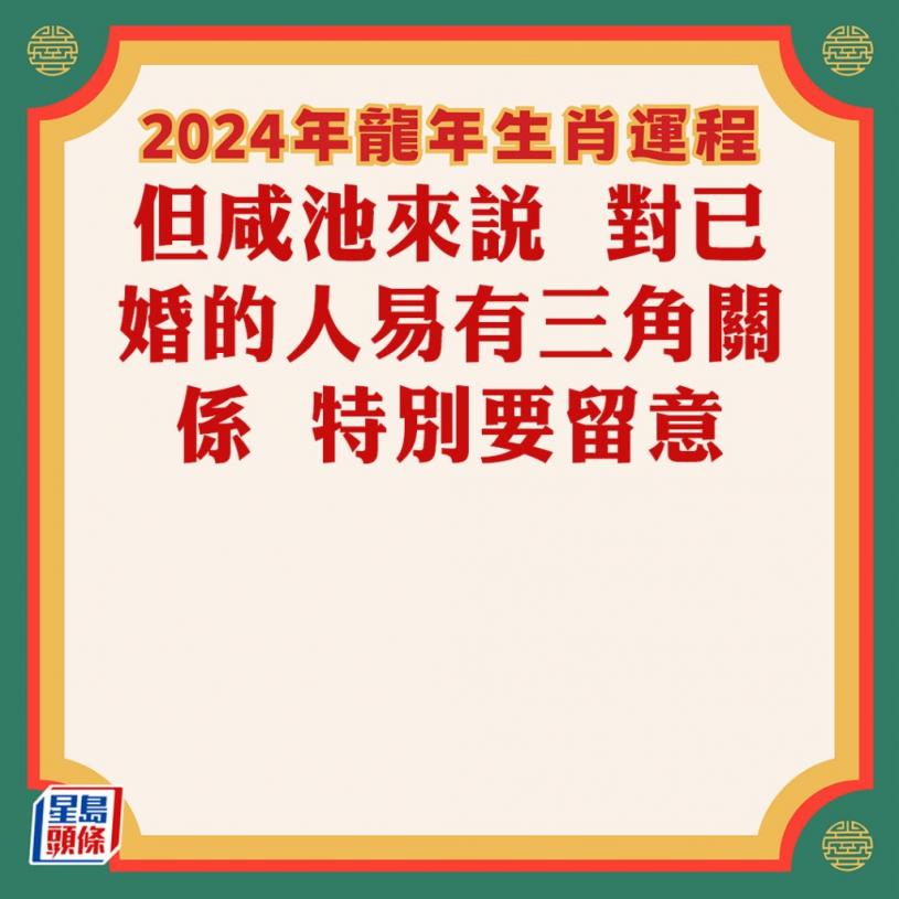 凶星有咸池,感情易生烦恼,但咸池都不能说是感情烦恼星,因为咸池都是桃花星,不过只是雾水桃花。什么是雾水桃花?就是跟已相识的人突然走在一起,但快来快去,这就是雾水桃花。即使有雾水桃花都好,今年不一定会散去,如拖过今年就有机会成为真桃花。但咸池来说,对于已婚的人易有三角关系,需特别留意,不过,咸池如借助人缘是非常有帮助,人家对你会特别好,工作会容易成功,所以咸池这个桃花是很两极化,不是特别好或特别差,总之不要变成三角关系就好。