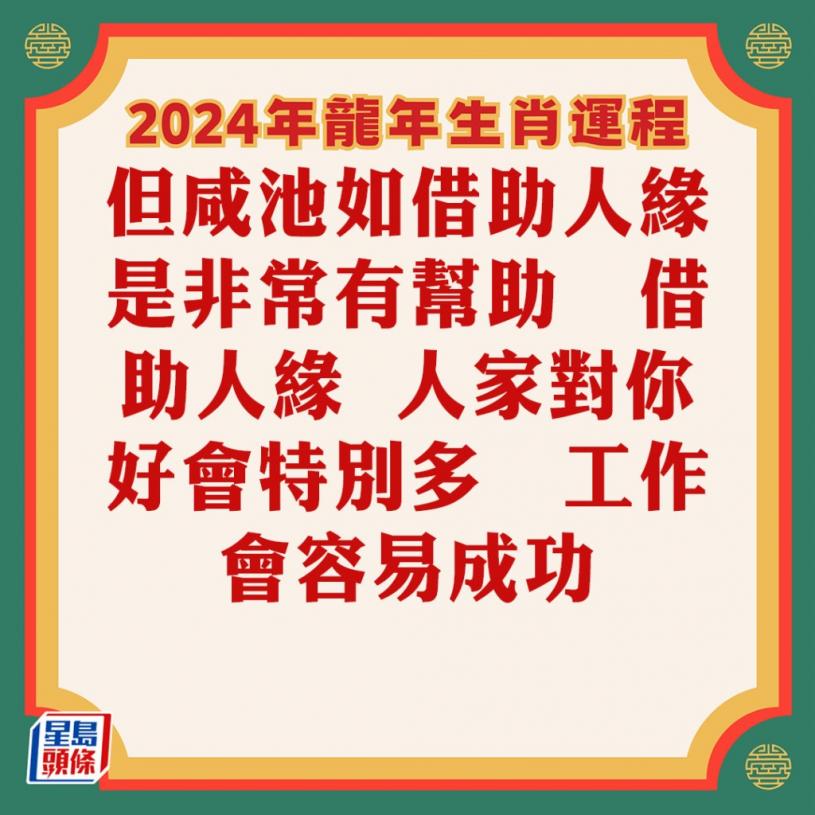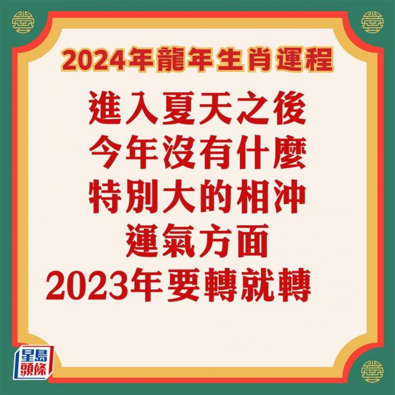 属龙今年来说肠胃比较差,农历三、六、九、十二月都要留意,所以今年在饮食上要小心,生冷及煎炸食物少吃为妙。运气方面没有直接关系,虽然属龙的运气只是排名第十二,但主因是受到犯太岁影响,其实今年的运气都比较平稳,今年来说是带水年,对春夏天出世的人有利,但秋冬天出世是没有用。如果是春夏天出世,这两年工作不如意,希望转工的话,2024年是短期内唯一一年可以转工。