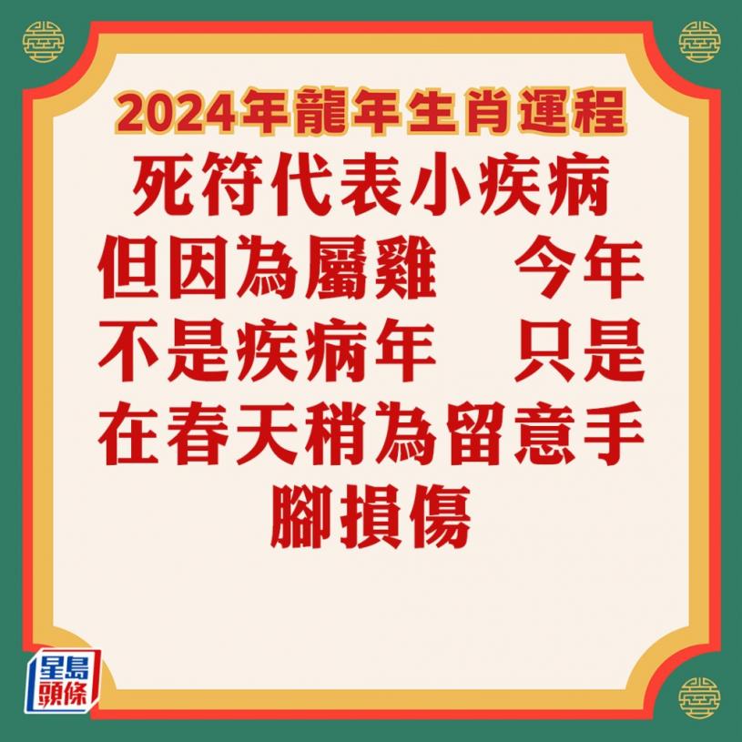 而死符星代表小疾病;小耗代表小破财,而对小破财,如平常想买的不舍得买,就可借助小破财去应验。死符代表小疾病,但因为肖鸡今年不是疾病年,只需在春天稍为留意手脚损伤。当进入夏天后,今年没有什么特别大的相冲,工作方面2023年要转就转,到2024年要转工的机会不大,如在2024年真的很想转工,春夏天出生的人在短期内可稍为转一转,因为今年2024年是带水的一年,而对于春夏天出生的人来说稍为有利。相反,如在秋冬天出生,2023年转工的话,2024年会稳定一点,如果还想转的话,2025年至2027年是好时机,都会比2024年好。