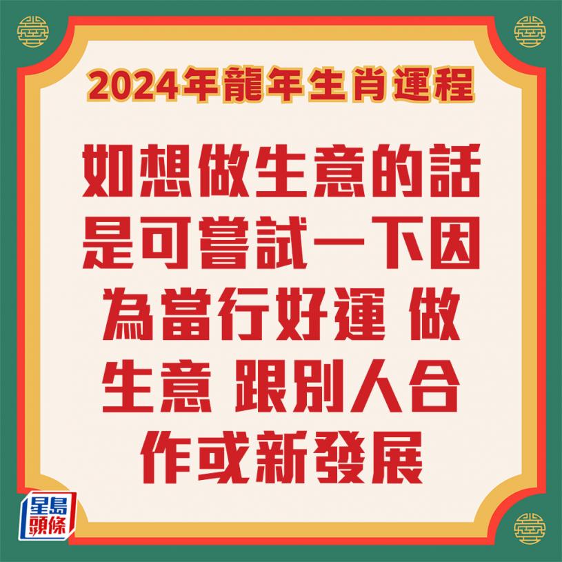 屬雞的朋友今年財運非常好,因為正財、偏財都進入命宮,如想做生意的話是可以嘗試一下,因為當行好運時,做生意及跟別人合作或是新發展才可以去嘗試。