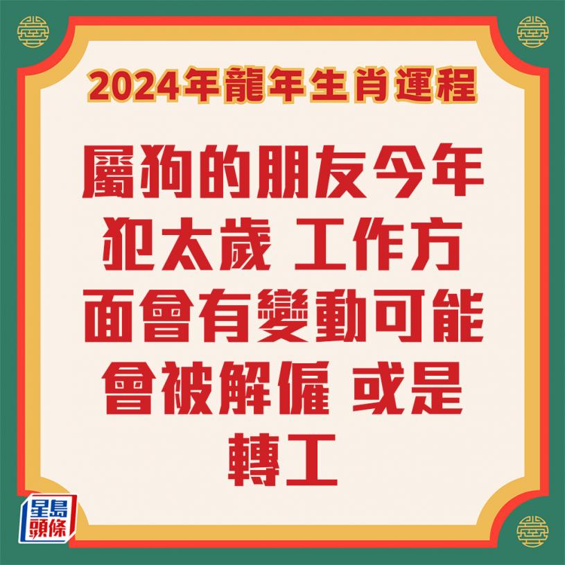 屬狗的朋友今年犯太歲,工作方面會有變動,可能會被解僱或是轉工。現時的網騙嚴重,要小心留意被騙,因為2024年會遇到官非,有是非會被騙,這個機會會較大。