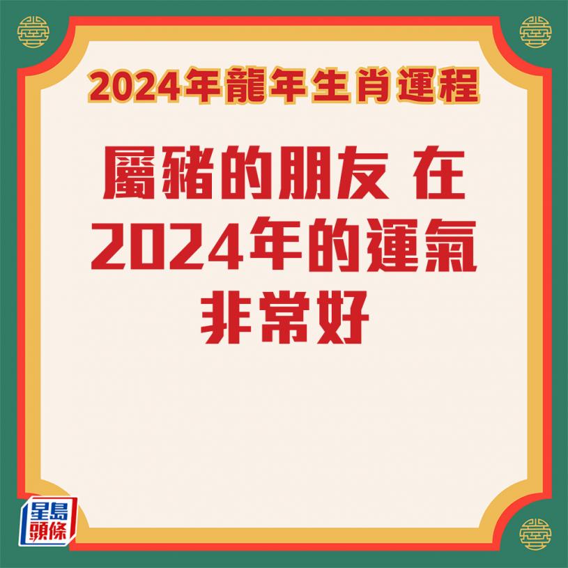 屬豬的朋友在2024年的運氣非常好,本身在十二生肖當中,豬的運氣就是最好,因為在十二生肖當中,屬豬是不用太吃苦,加上2024年整體運勢好,正財、偏財都好,感情運亦不錯。