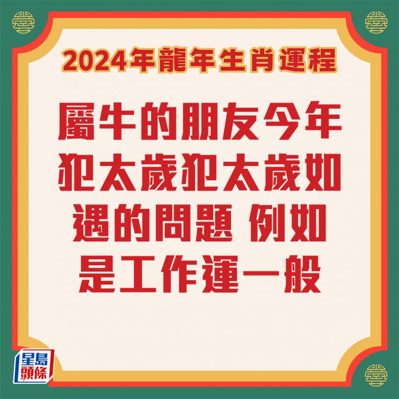 屬牛的朋友今年犯太歲,犯太歲會遇到的問題,例如是工作運一般,有機會轉工。就算不轉工,工作上都會非常難過,會感到吃力,壓力非常大,每天工作都是渡日如年。今年的工作運是非常煩惱,即使轉工都可能會愈轉愈差,不要只想去轉工,反而是去想化解方法。