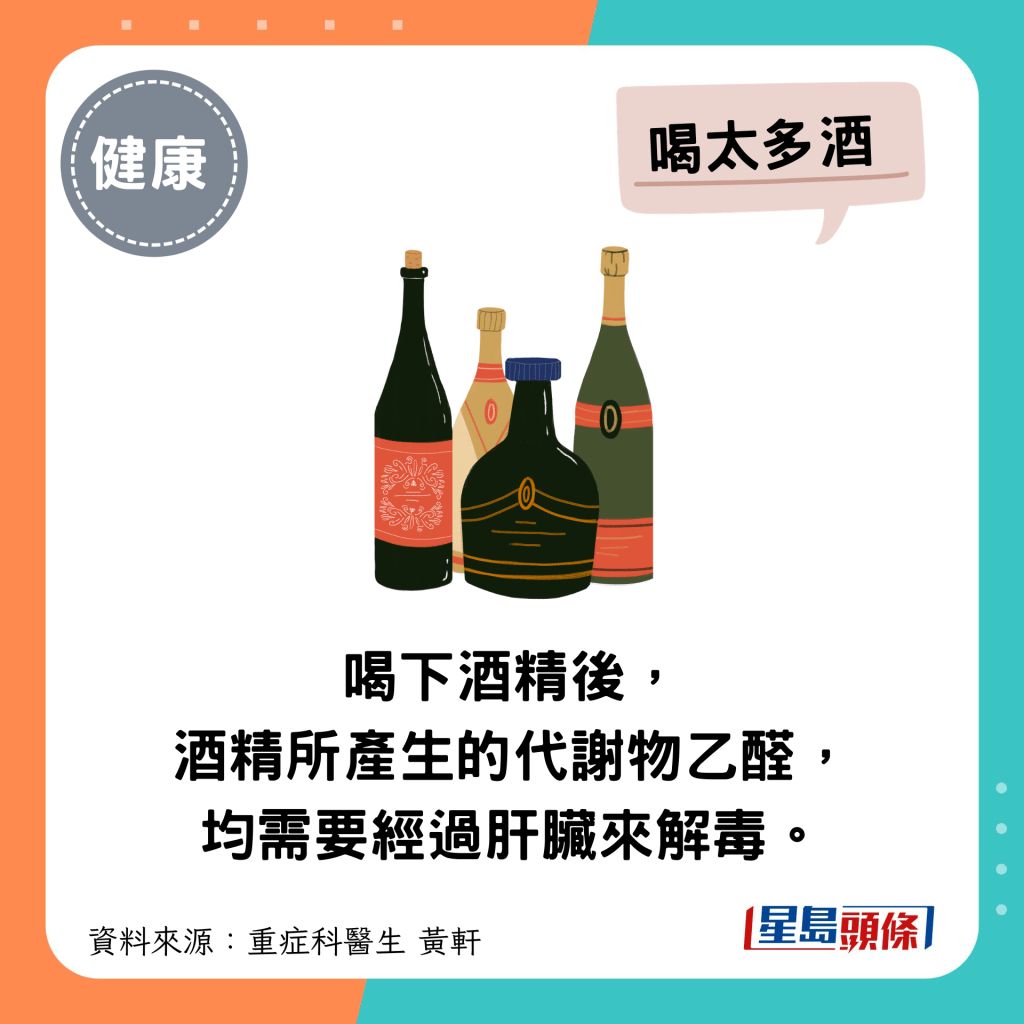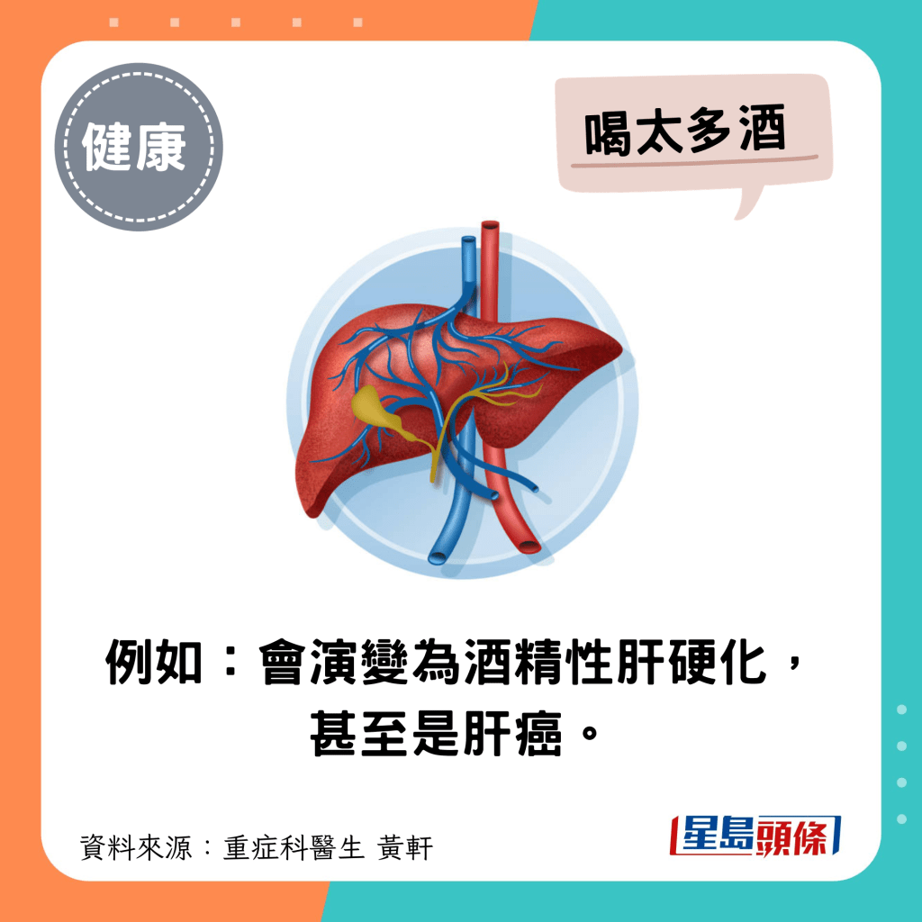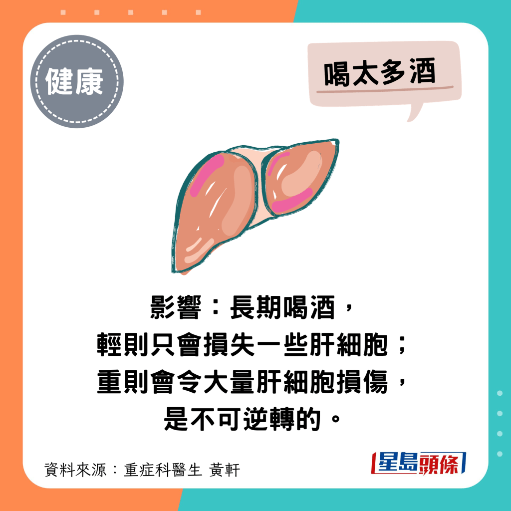 黄轩医生提醒,比起熬夜,过度饮酒、胡乱吃药或吃太多药、吃太饱这些日常生活习惯,比起熬夜更伤肝。他警告,若不修正,肝脏最终遭会受极大伤害,最后更可能牺牲全身的健康。