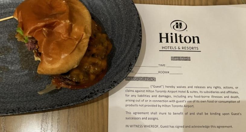 一名Hilton酒店发言人则对CTV新闻多伦多分部记者说,虽然他们通常不要求签免责声明,但是酒店遵守安省所有的食物安全法规。