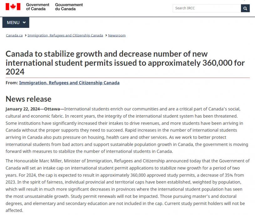 今年本國新的學生簽證,會減至364,000人,比舊年少35%,不同省份,會按人口訂定減幅,意味包括安省在內的一些省份,將減少50%或更多。至於2025年的國際學生人數上限,會在今年底公布。而攻讀碩士、博士、中小學教育的人員不計入上限。 目前的學習許可持有者不會受到影響。