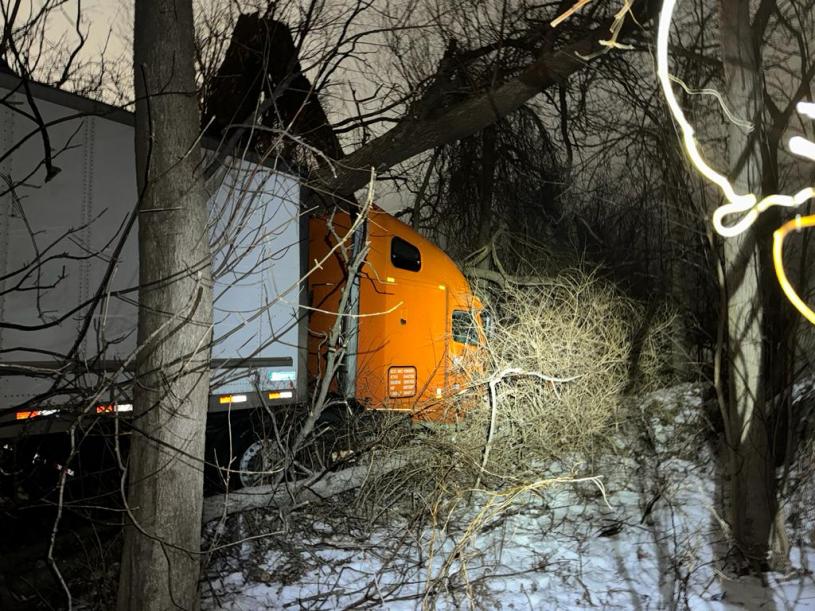 安省警方称,司机失控令货车越过了雪堤,距离道路100米的地方撞上了结冰沼泽中的树木。