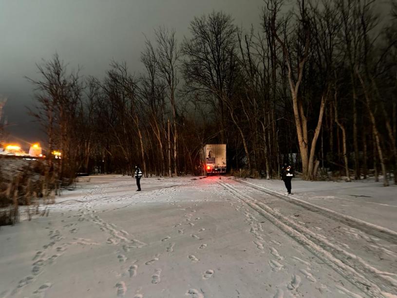 警方发布的图片显示从高速公路上穿过雪地的车轮痕迹,货车停在森林边缘的结冰区域。