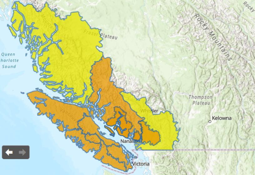 周四下午進入洪水警戒範圍的地區包括豪灣(Howe Sound)、陽光海岸、海天區域(Sea-to-Sky region)和北岸山脈,以及菲沙河谷北部地區,即高貴林港到夏里遜(Harrison)菲沙河支流沿岸。
