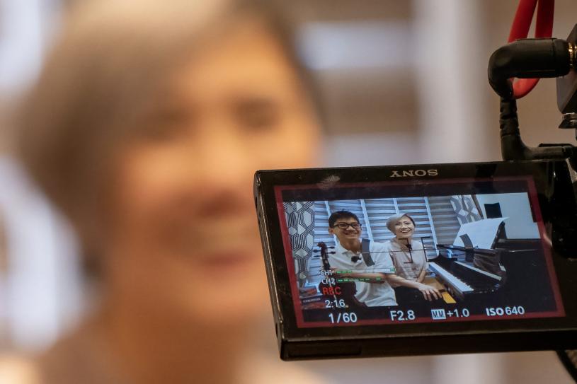 音乐家庭,薛梅与14岁儿子闲来合奏一曲。