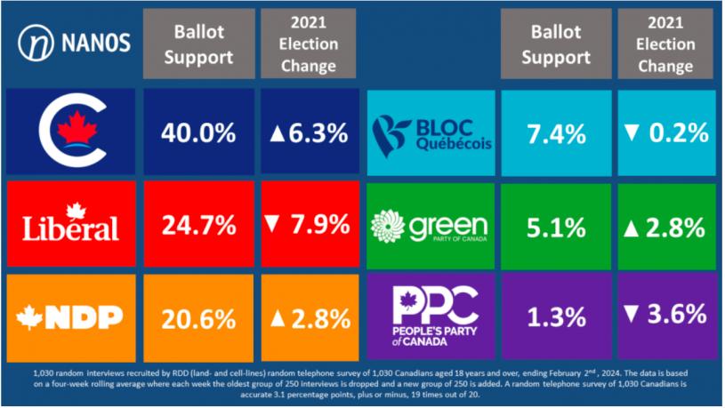 据CTV报道,如果今天举行选举,联邦保守党将获得40%的选票支持,自由党支持率为24.7%,保守党领先了15个百分点。