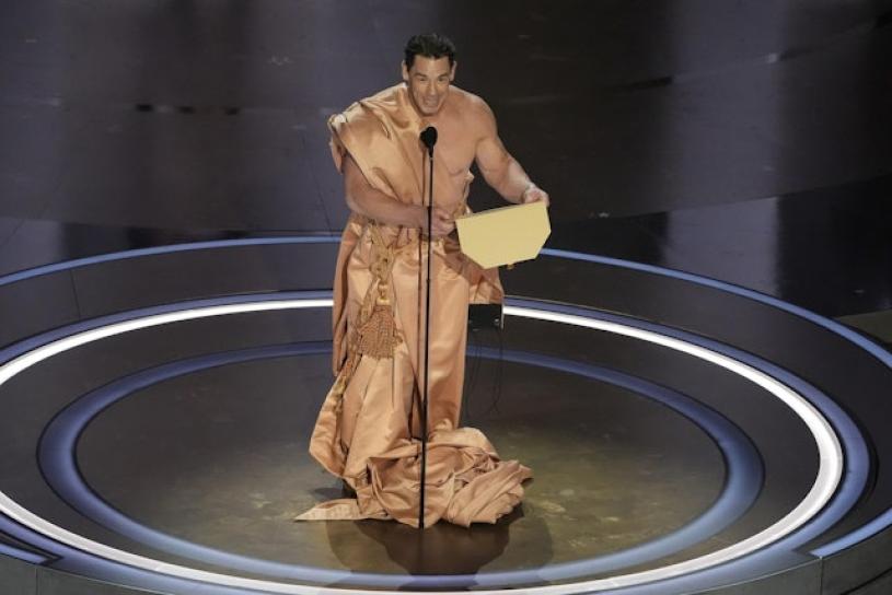 莊先拿(John Cena)頒發「最佳服裝設計」大獎時,突然全裸爆肌現身,只用頒獎信封遮掩下體,全場掀起一陣高潮!