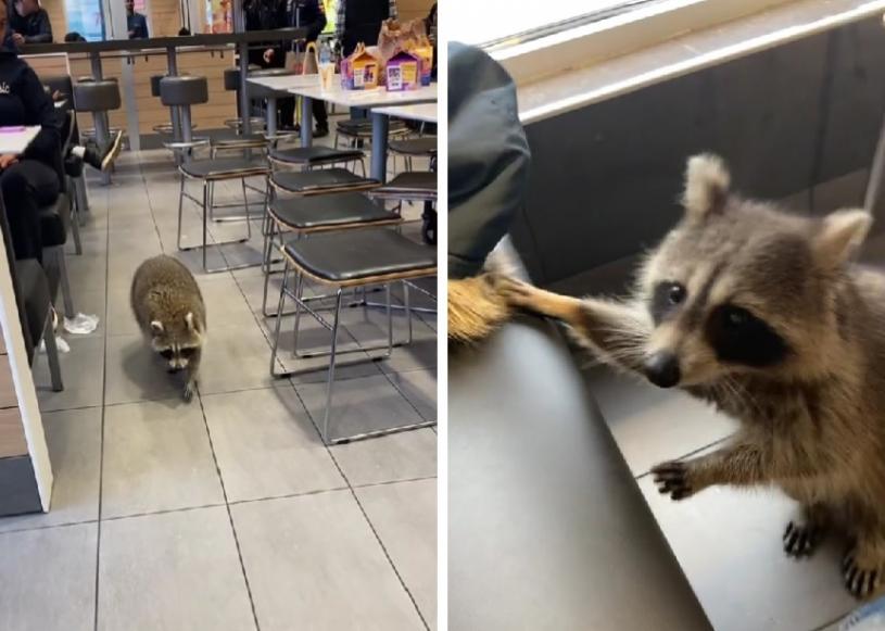 浣熊吃腻了果子 直接光顾麦当劳 还站起来索要食物
