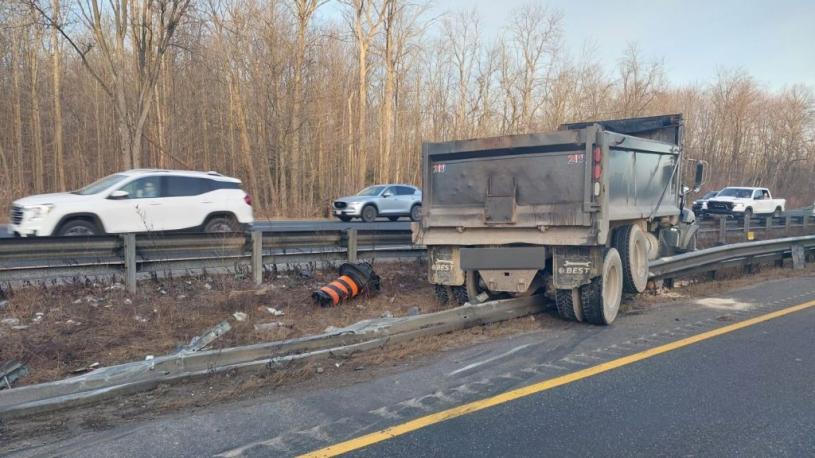 警方表示,由于卡车装载了超过 80,000 磅的碎石,需要动用三辆重型拖车将车辆从护栏中拉出。