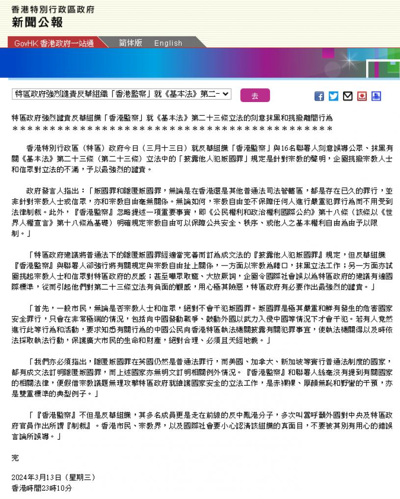 香港特別行政區(特區)政府於香港時間周三(13日)晚上11時10分發佈新聞稿,就「香港監察」聯合16位國際宗教或信仰自由專家所發表的聲明,憂慮23條直接威脅宗教自由作出回應。新聞稿形容「香港監察」為反華組織,斥聲明抹黑《基本法》第二十三條,並予以「最強烈譴責」。