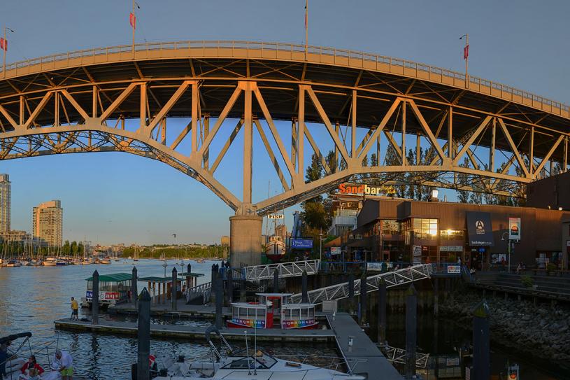 位于固兰湖岛(Granville Island)的黄色地标Tap & Barrel Bridges。为这座充满艺术气息的小岛增添了多元化魅力。作为固兰湖岛的海滨露台餐厅,可以眺望对岸的耶鲁镇(Yaletown)城市街景,以及贯穿市中心和温西的两条高架桥,是打卡好去处。