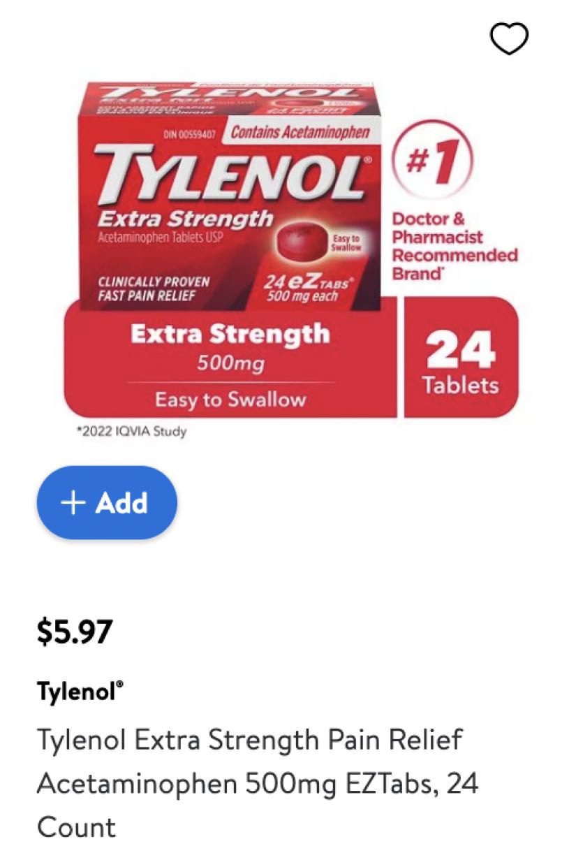 但是,当你在沃尔玛加拿大网站上查看其他泰诺规格时,情况看更是令人沮丧,只见两包特强泰诺——总共48片——零售价为32.99元,即每盒16.49元。