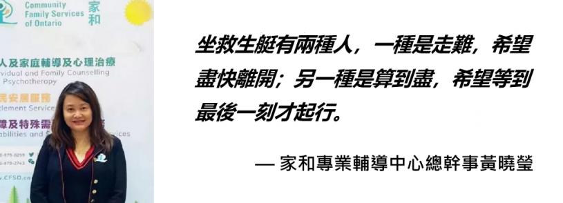 安省社会服务机构家和专业辅导中心(CFSO)总干事黄晓莹博士分析,救生艇申请者有两种截然不同的心态。“坐救生艇有两种人,一种是走难,希望尽快离开;另一种是算到尽,希望等到最后一刻才起行,并在取得PR后,以最快时间离开加拿大。这些人没打算在加长期生活,根本不算是移民。”