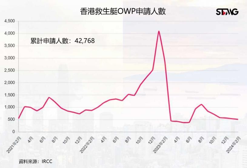 从2021年初到2024年2月间,移民部向香港人发出了约2.46万个学签。连同过去三年批核的约3.5万个OWP,估计目前已有超过5.9万人登上了救生艇。此数尚未包括循其他途径(如难民、封闭式工签、EE快速通道等)来加的港人,亦未计算仍在处理中的申请。
