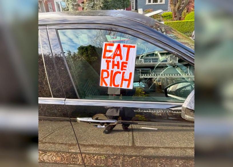 【星岛综合报道】泊在温哥华两个传统富人区的豪车遭人破坏,肇事者还留下写着“给富人添堵”(Eat the rich)字眼的纸条。