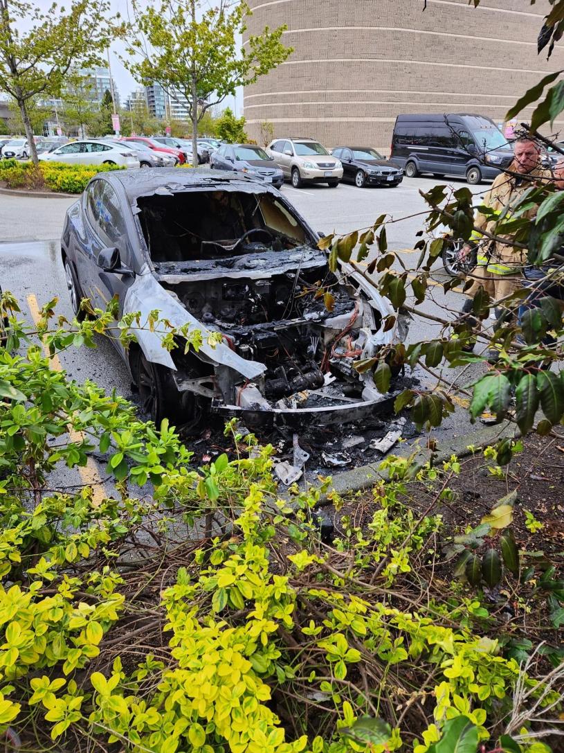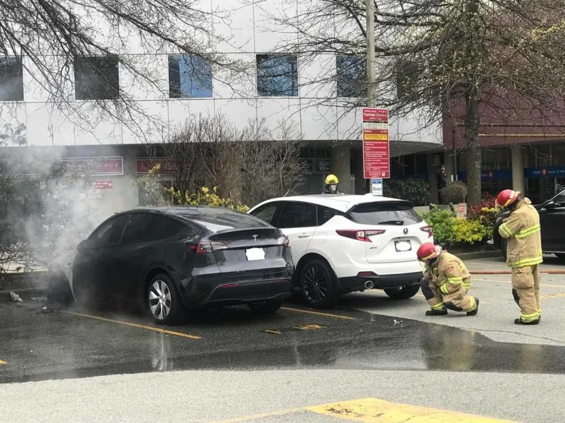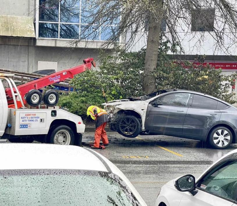 【星岛综合报道】列治文八佰伴中心停车场周六(20日)下午有一辆停泊中的Tesla电动车发生大火,消防员到场将火扑熄,起火车辆严重焚毁,被拖车拖离现场。