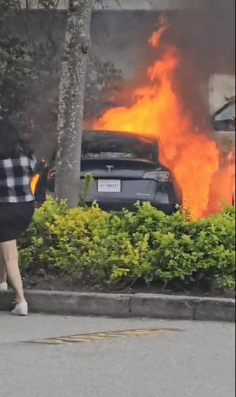 画面可见火势相当猛烈,烈焰冲天,但未有波及其他车辆。火警发生时,在与起火Tesla仅相隔一辆汽车的位置,有人匆忙从车尾箱取出物品离去,旁观者不禁替其揑一把汗。