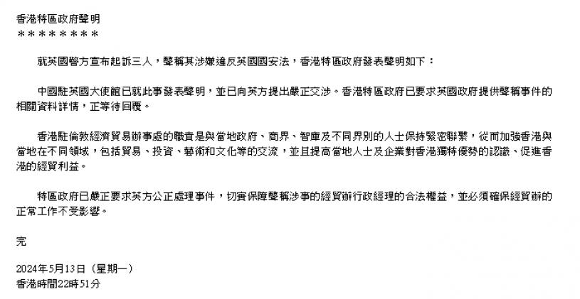 中國使館「敦促英方立即糾正錯誤」,「確保在英中國公民各項合法權益」;港府要求英方「切實保障聲稱涉事的經貿辦行政經理的合法權益,並必須確保經貿辦的正常工作不受影響」。