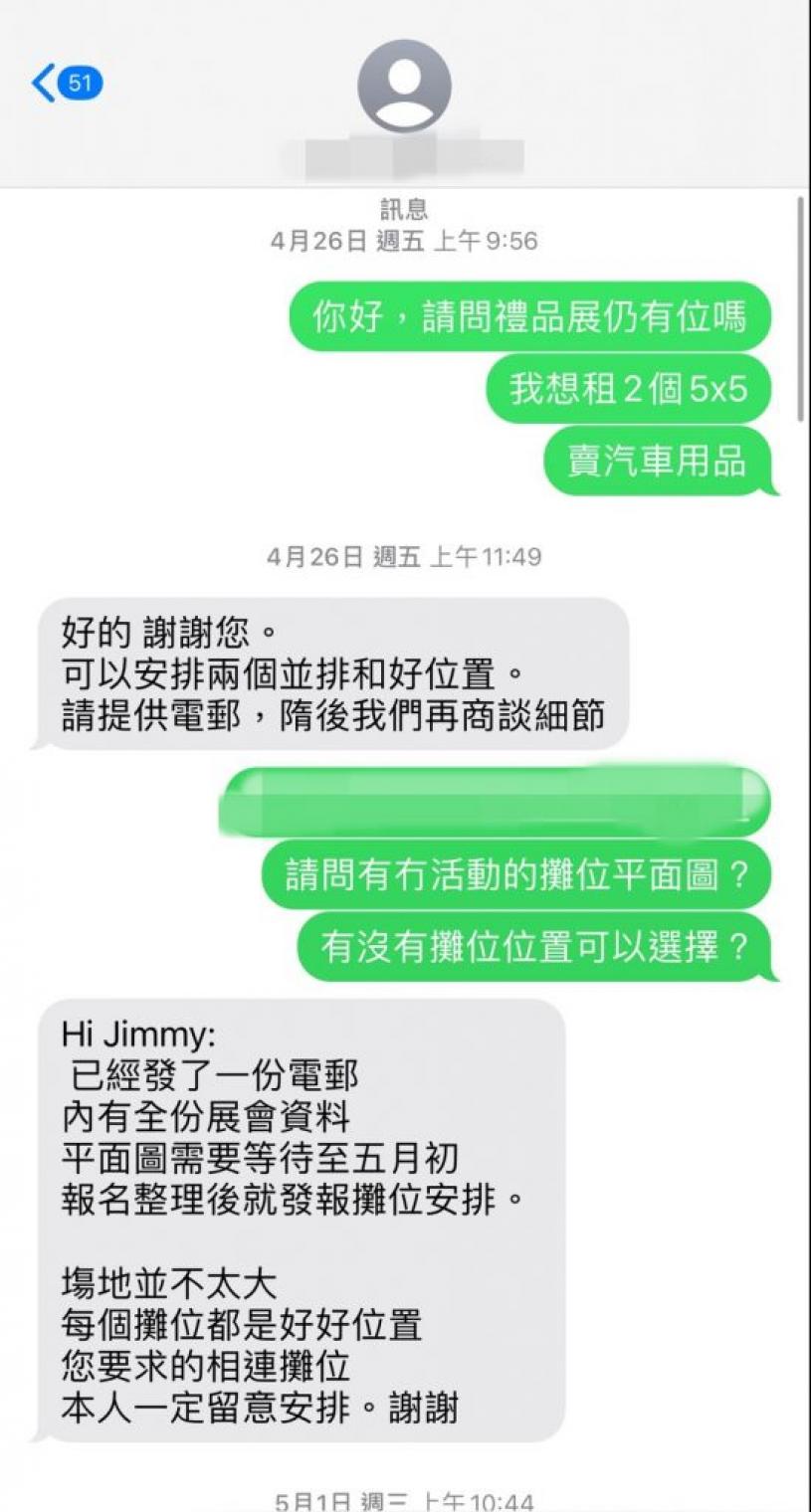 Jimmy受宣传海报上中的预期人流吸引,于4月26日向Jason查询租摊位。(截图由受访者提供)
