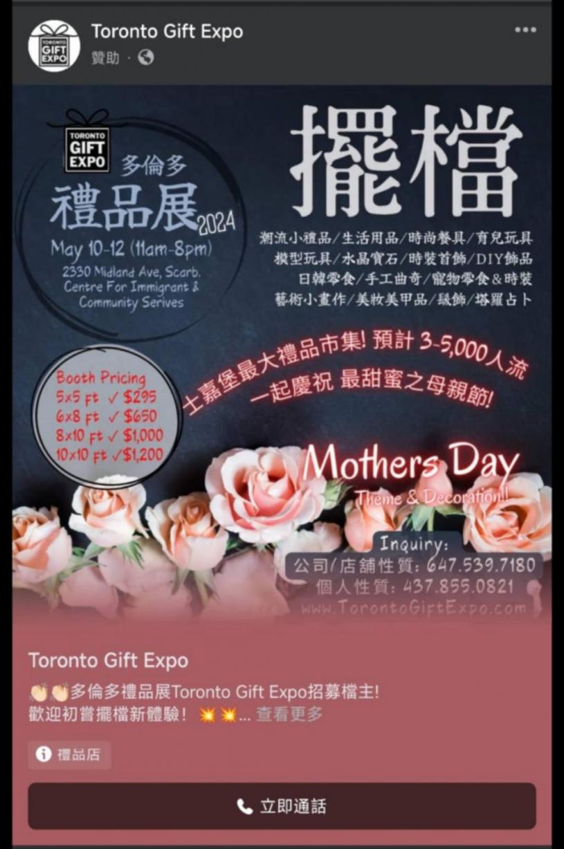【独家/星岛追击报道】多伦多礼品展𝖳𝗈𝗋𝗈𝗇𝗍𝗈 𝖦𝗂𝖿𝗍 𝖤𝗑𝗉𝗈母亲节市集于上周末一连三日于士嘉堡华咨处举办,近日网上出现“档主苦主群组”,指责主办方“夸大宣传”误导档主,于招揽档主宣传中写上“预计三天人流3-5,000人!”但市集后大批档主质疑人流数量与宣传品预期相差甚大,档主要求主办方作出补偿。