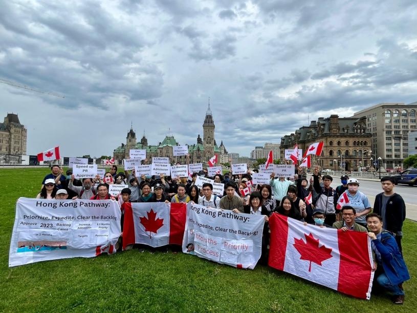 【星岛综合报道】继4月行动后,加拿大香港救生艇计划 Hong Kong Pathway 永居申请人今日再度前往渥太华加拿大移民、难民和公民 (IRCC)总部请愿,促请当局增加香港救生艇移民目标配额