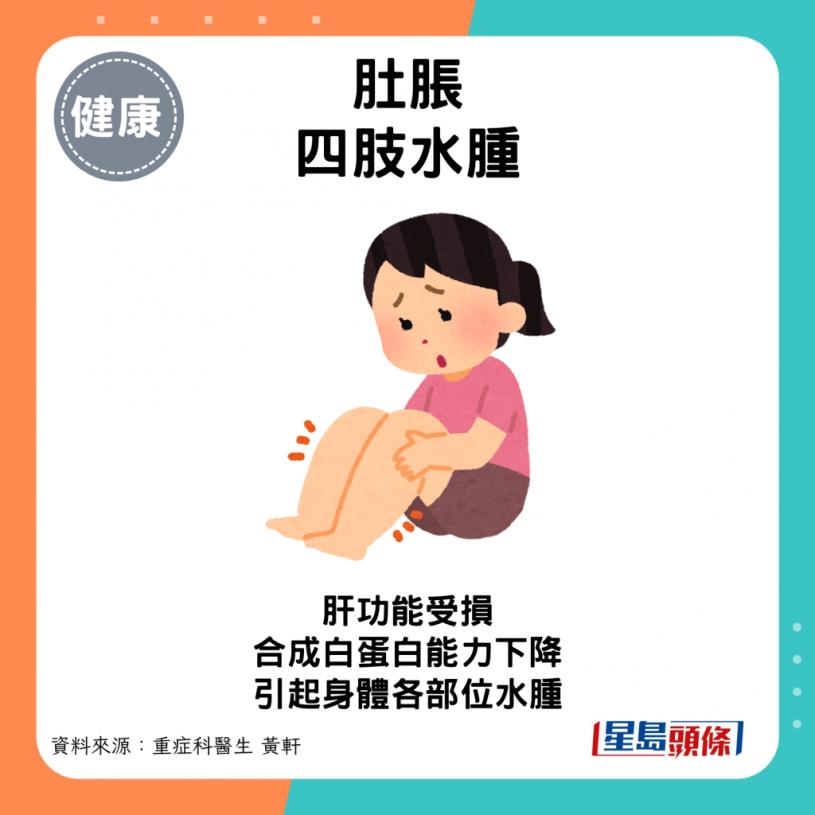- 白蛋白是維持血液中的膠體滲透壓的關鍵因素,當其水平下降時,會導致血液中的水分從血管內渗出到組織間隙,引起身體各部位水腫,包括肚子變大(腹水)、下肢水腫等。另外,還可能出現疲勞、虛弱、食慾不振、消化不良、呼吸困難等低蛋白血症症狀。