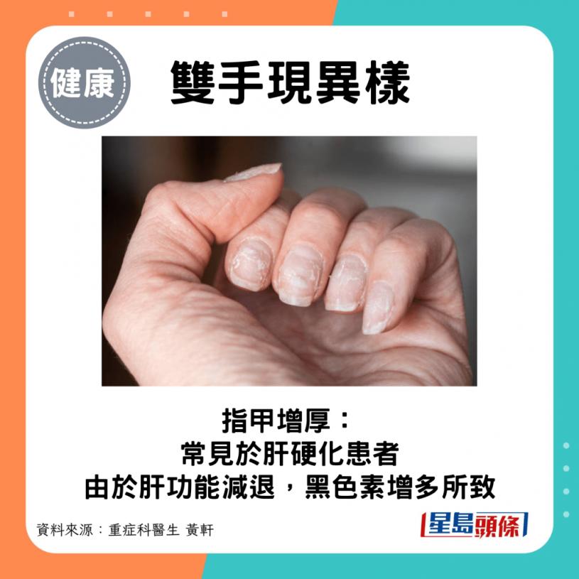 - 指甲增厚:肝硬化患者的指甲可能變厚,呈現縱向隆起、白色帶,甚至近端呈粉狀白色。這是由於肝功能減退,黑色素增多所致。